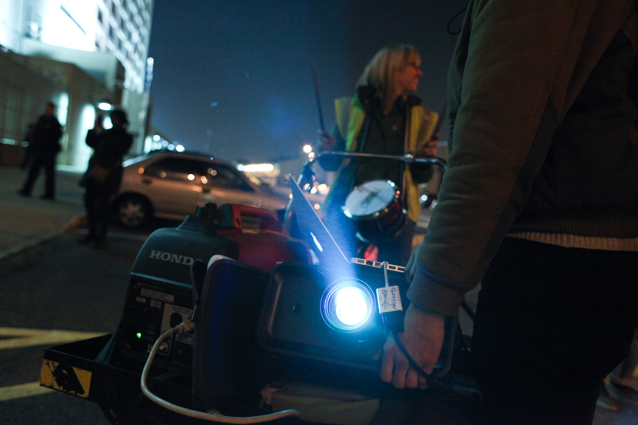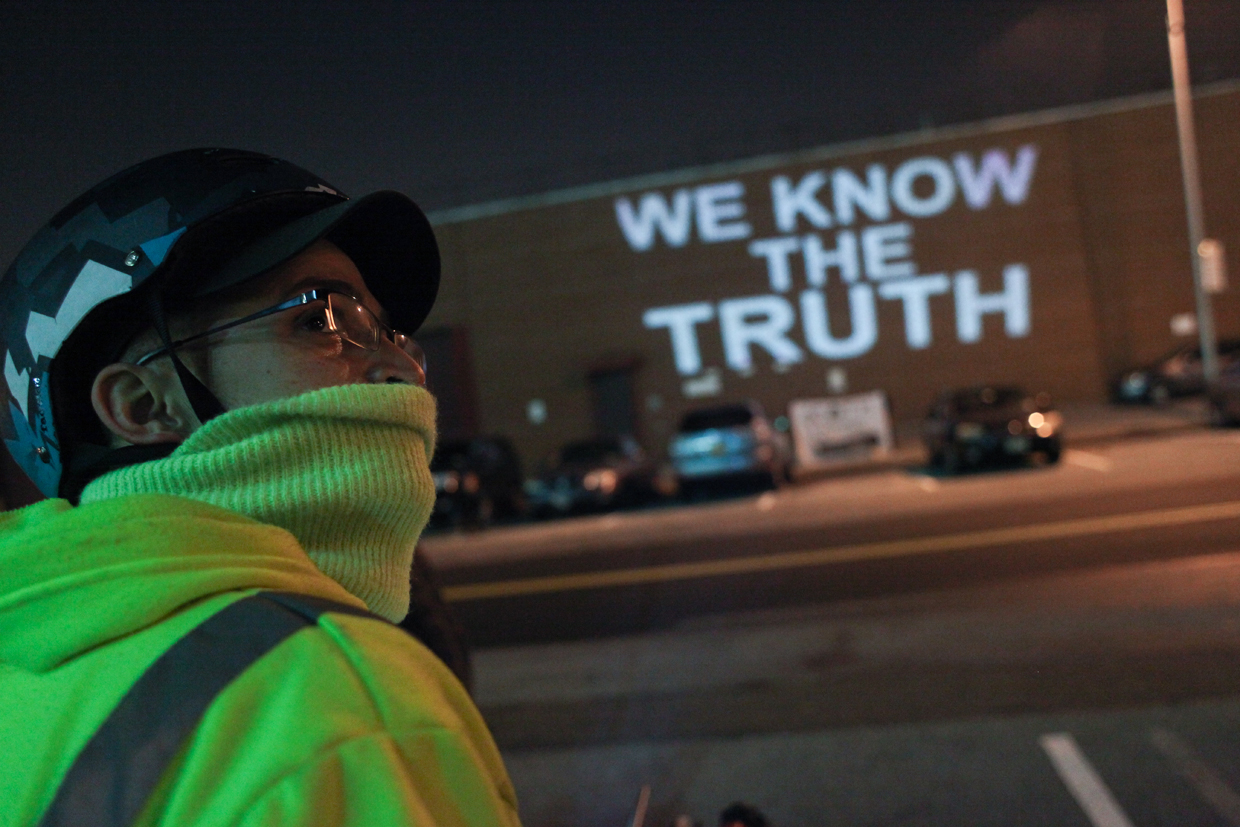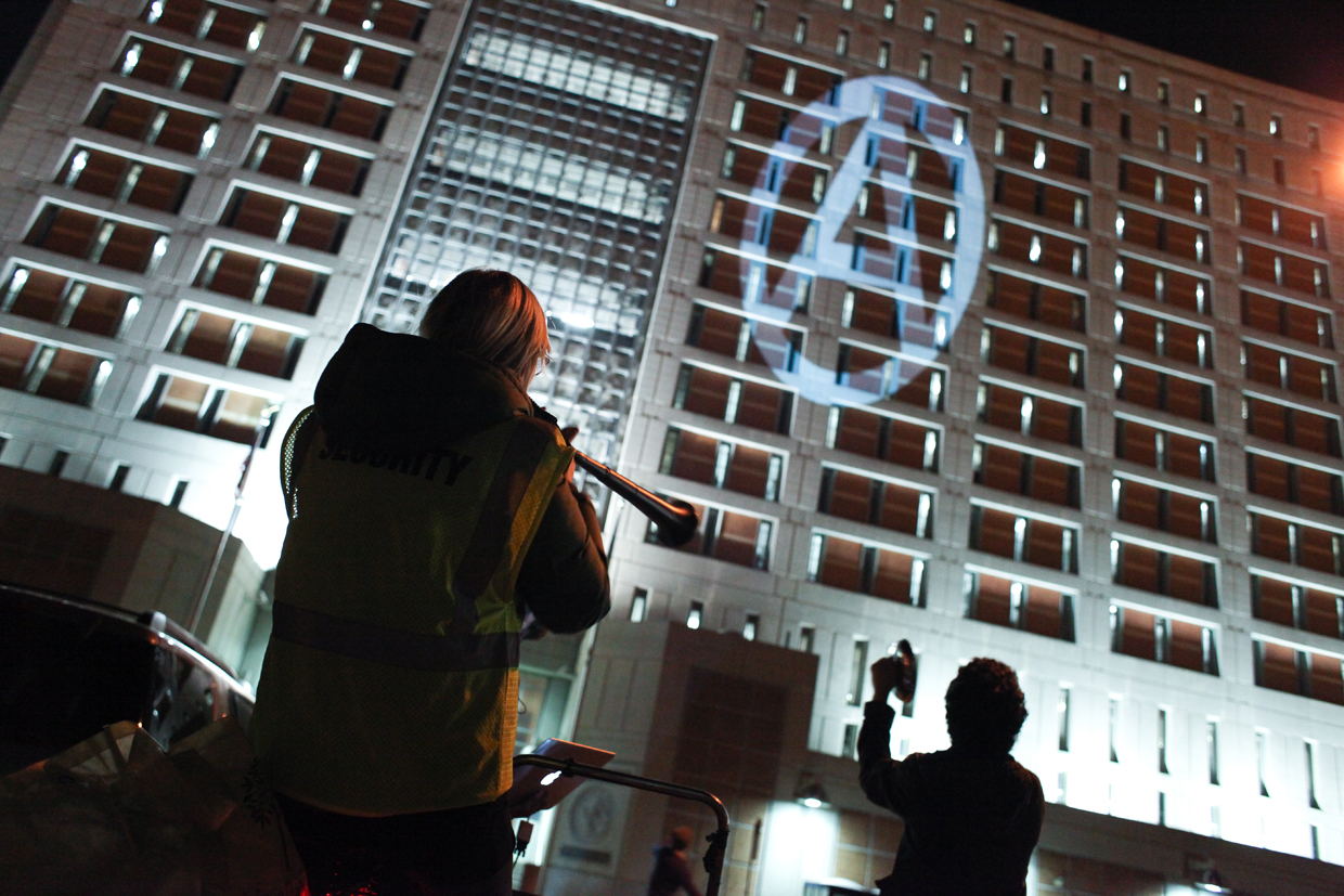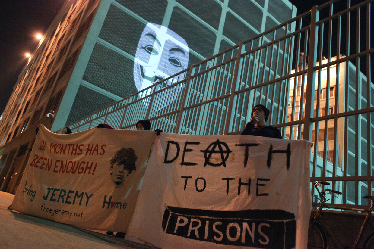 » Demonstrators from the In our Hearts Collective brought instruments, pots and pans, and their voices to make noise loud enough to be heard within the walls of the detention center. The Illuminator projected messages of solidarity on the bleak walls of the prison. “Free Jeremy Hammond!”, “Solidarity with all Hacktivists!” and images of the infamous Anonymous Guy Fawkes mask lit up the night. Additional images are posted below.
