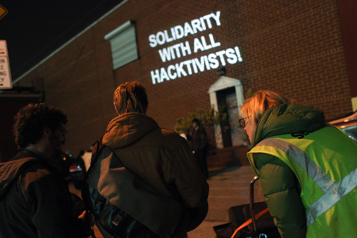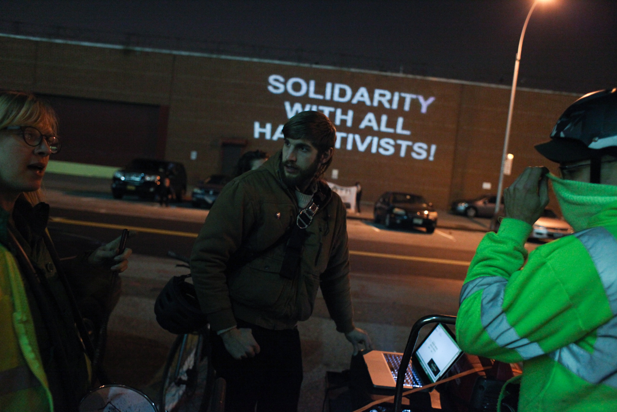 [NEW YORK, NY] A collective of projection artists and activists lit up the bleak walls of The Brooklyn Metropolitan Detention Center (MDC Brooklyn) last night with visually arresting images and messages proclaiming solidarity with jailed political activist Jeremy Hammond. The artists’ stunning action, which captured the attention of prisoners and administrators alike, comes two weeks after the 28 year old activist was sentenced to 10 years in federal prison for violating the Computer Fraud and Abuse Act (CFAA) of 1984. Hammond’s sentence, handed down on November 15th, follows his May 28, 2013 plea of guilty to participating in the Anonymous hack into the computers of the private intelligence firm Strategic Forecasting (Stratfor). The hack and the subsequent publishing of millions of exfiltrated Stratfor emails has sparked a global conversation into the unregulated operations of private intelligence firms and their frequent extralegal activities.